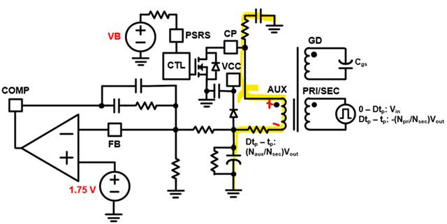 In the related thread (original question), I have questioned whether " actively cancelling (through the use of CP output) the leading-edge voltage overshoot (causing the feedback capacitor to peak-charge)" can be truly postulated. Because the body diode conducts immediately as soon as the primary Mosfet is switched off and the leakage inductance spike is thus exposed to the feedback capacitor. But there is a sort of corollary: only if there would be a small delay of the CP-Mosfet being switched on, until that, the nominal winding voltage does not inject current to the capacitor because in the previous cycle the capacitor is charged with the winding voltage during primary switch off-state minus the minimal voltage drop over the "ideal diode" behind the CP terminal. On the start of the next cycle, only the body diode conducts and because the capacitor has not dropped the voltage more than a few mV, the net voltage "available" to the capacitor is lower: winding voltage minus body diode. So in this minimal time interval, the leakage inductance spike may inject some current (limited by the series resistor), but it has no effect. And hence the capacitor voltage is quite accurately sensing the net winding voltage.