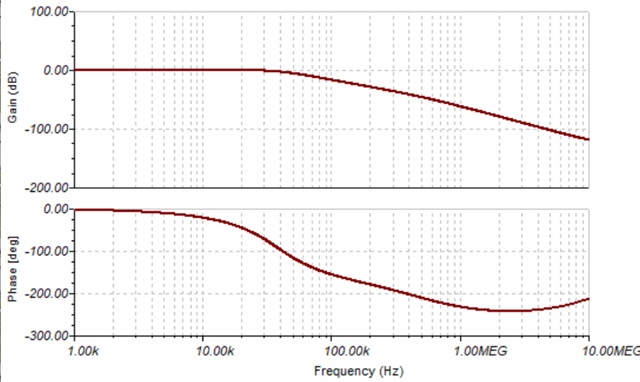 In this circuit, Q6 is suspected to consume a lot of loop margin, so I want to perform a bode analysis. However, the Bode diagram obtained by simulation does not have the cross frequency, as shown below: