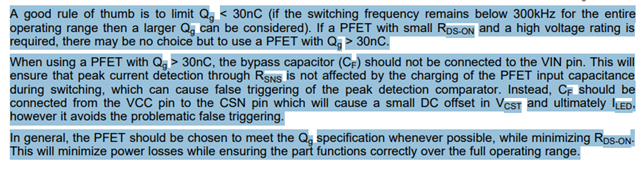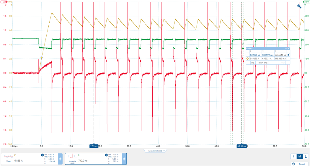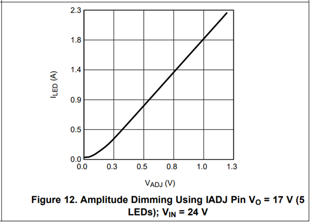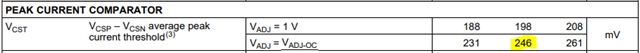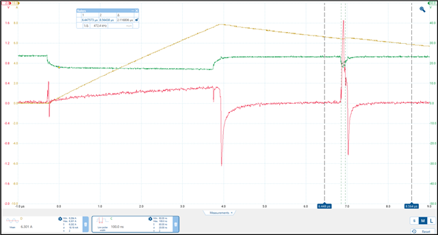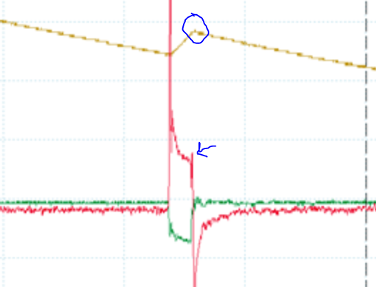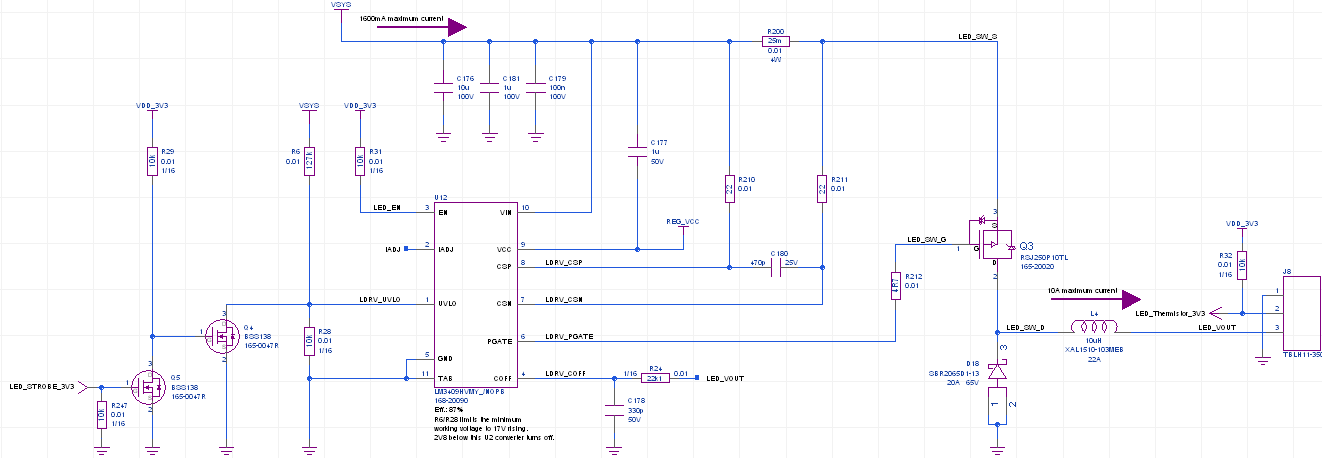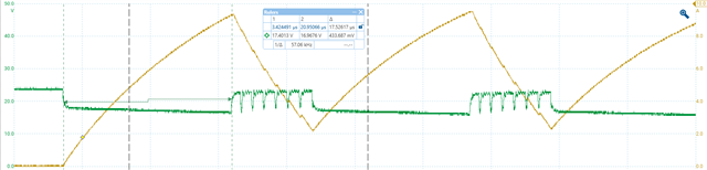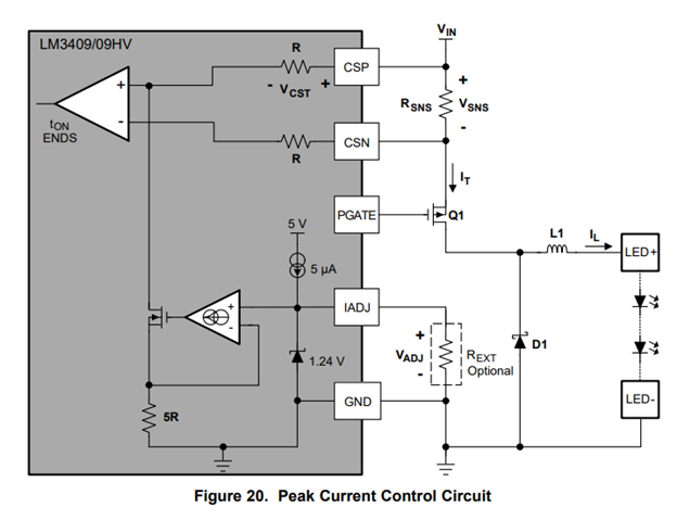 We successfully made designs with LM3409 before, but this one does not work as it should. As you can see below, most of the times when the P-FET is turned on (gate voltage seen in green) the LED current (shown in yellow) barely rises before the FET is turned off again. The time corresponds closely to the minimum on-time specified in the datasheet. I also posted the schematic we are using, the only difference to previous projects is, that we only drive a single LED, meaning V_IN is 24V while V_OUT is only 4V with maximum LED current of 10A. The oscilloscope screenshot is at V_ADJ of 1.24V.