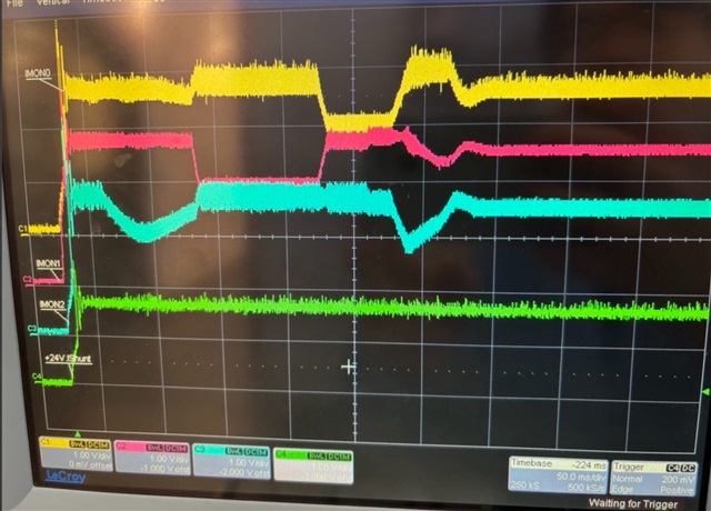 The attached image shows 3 of the 4 CSO lines (IMON0-2 in the image) and the 4th trace is the high side shunt prior to the electronic load (sum of all 4 supplies). While not shown, voltage stabilizes within 7ms of the initial rising edge and the 4th CSO line behaves similarly to the ones shown. Please ignore the large amount of noise that can be seen on the CSO line traces as we've proven that that is a measurement artifact