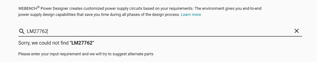 The LM27762 datasheet Section 8.2.2 Detailed Design Procedure encourages you to use webench.ti.com/.../quickview.jsp WEBENCH fails to find it, even if you manually add the part number.