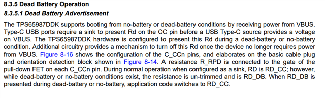 What my concern is when certain "DFP"(Source) equipment apply certain "Rp" to TPS65987DDK in above condition, TPS65987DDK behave as "Sink" and do NOT show "Not connected"(Not "vOpen" state) state.