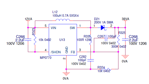 we have a design for 12VDC input, 38VDC output, boost power supply by LMR64010.