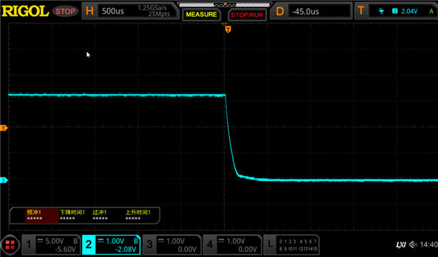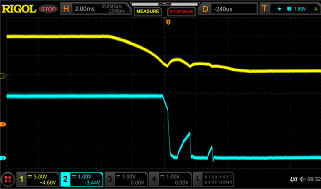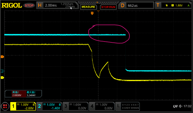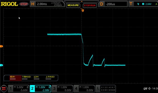 The load is 20A. After the power is cut off, the output drops and then rises sharply. What is going on?CH1 is the output and CH2 is the enable pin.