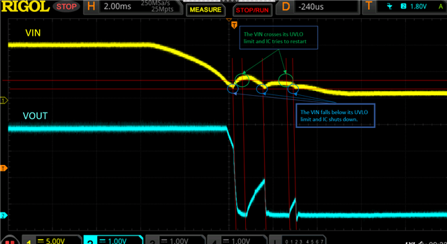 But this does not persist long as again IR loss brings the Vin pin below the UVLO level, and the leftover energy left on the input side is completely used up finally shutting down the IC.