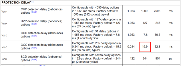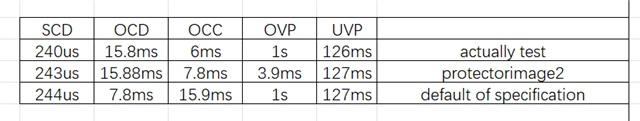 but the OVP is 3.9ms(while datasheet is 1000ms), the OCD is 15ms(while datasheet is 7.8ms), the OCC is 7.8ms(while datasheet is 15.9ms).