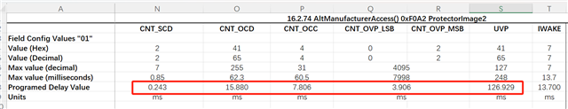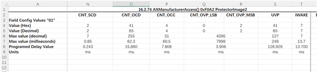 so we read protectorimage1 to see actual HEX value in the gauge. it is 02 41 04 00 02 41. we use a transfer tool. only the SCD and UVP are meet datasheet.