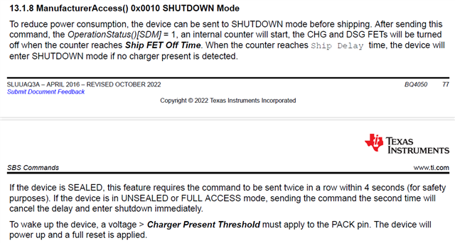 Because sometimes the customer will send three times shutdown command and then BQ4050 could enter shutdown mode under unsealed.