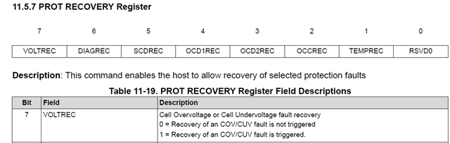 I am trying to configure the BQ76905 monitor to fault and trip when the cells are under voltage. I do not want autonomous recovery, so I disabled that in the data memory settings (cell undervoltage hysteresis register). The Threshold is set at 2.4V and delay is the default 10 ADSCAN intervals. The CUV fault properly trips, but I cannot manually recover by writing 0x80 to PROT_RECOVERY command. The CUV bit stays set in the Safety Status A register and the DSG FET remains off. The device is not sealed. I tried setting the PROTRCVR bit in the data memory FET options register just in case but that did not help.