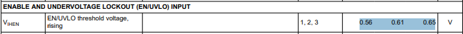 The sim uses the max spec, 0.65V. So for an input of 5.5V, the maximum UVLO level, where the EN(max) spec of 0.65V will still be met, will be about 4V with a resistor of 13.5k as RBOT_EN (kOhms).