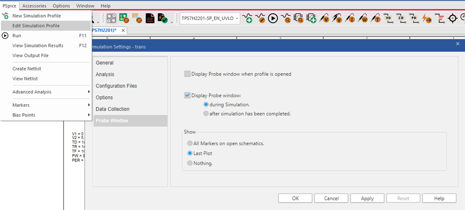 We set up our sim profiles to show certain traces and plots which appears to the user as "automatic". When a new or different schematic and sim profile is used/created in PSPICE, the user needs to add the desired plots and traces. It is possible that PSPICE reset the traces and plots if the original schematic was drastically altered.