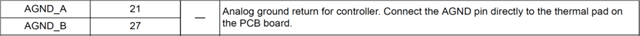 I have a question regarding the connection between AGND_A (pin 21), AGND_B (pin 27) and Thermal PAD (PGND).