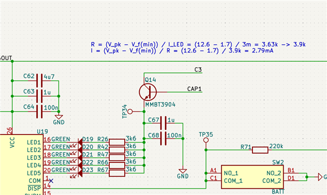 I am working on a 3S 18650 cell BMS design. I am confused on some of the reference schematics where for the LED pins a 1A BJT was used and there were no resistors to limit the current. In my design I put a MMBT3904 which is a 0.2A IC, 40V, NPN. If I am assuming correctly, CAP1 should be 3.3V from its internal LDO, C3 in my case is the top of my 3rd battery cell so 4.2*3=12.6V when fully charged. I am using ASMM-CF03-AP402 for my LEDs, they have a Vf of 1.7V to a maximum of 2.6V. Each pin for these LEDs can only sink 3mA right?