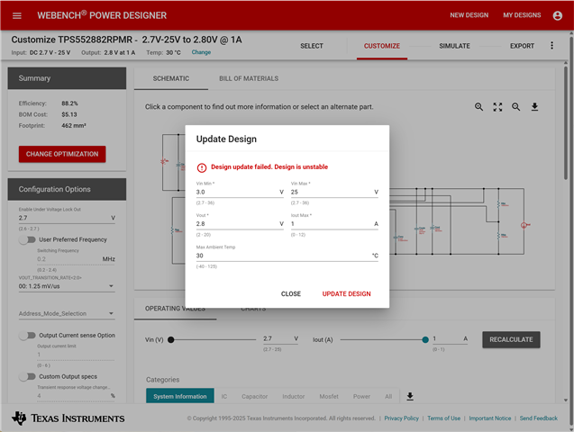 We are trying to use the TPS552882RPMR device with 2.8V/1A output for input range of 3.0V to 25V and Webench is saying the design is unstable.