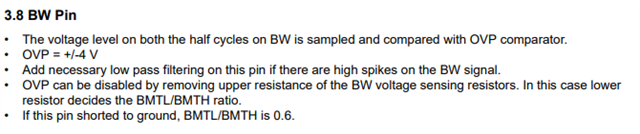 4. In the calculator tool, the BW pin voltage is derived from the bias turns, but in the PMP40766 schematic it is implemented using only resistors and capacitors. What is the difference between these two approaches?