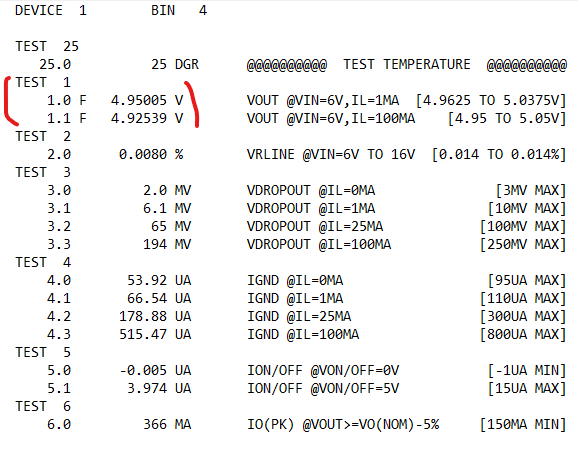We are testing some parts (LP2981AIM5-5.0/NOPB) with a date code of 2151 for a new project that requires preconditioning. we noticed that we are having issues with Vout (Test 1 (1.0,1.1) Listed as 'F' below in 4 of the devices that failed Vout Reading. we preconditioned the parts unbiased at the maximum storage temperature 150C first. We noticed the failures were in the 20mV range and summarized below. Could unbiased temperature cycling at maximum storage temperature cause this? What unbiased temperature cycling would you recommend?