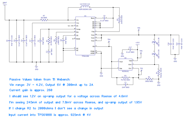 I'm trying to use the TPS61088 as an LED driver with a single 18650 lithium ion battery with a voltage range from 3V-4.2V. I'm driving two 3V LEDs in series between 300mA and 1.5A, and I have a 30mohm low side sense resistor and I'm measuring the voltage across it with a non-inverting op-amp and running it into the feedback pin of the regulator. It was my understanding the regulator would drive the output to regulate the voltage at the FB pin to 1.204V. I'm not seeing that. My notes are in the image. I pulled the passive component values from the TI Webench. If you need scope views from any node I can provide them.