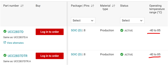 –25°C to 85°C for the UCC2837 and