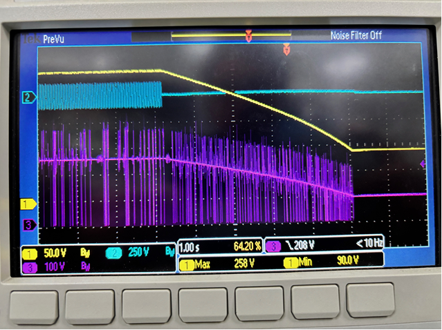 See below waveform, after AC OFF, the PWM is still switching until Vbulk drops to low.