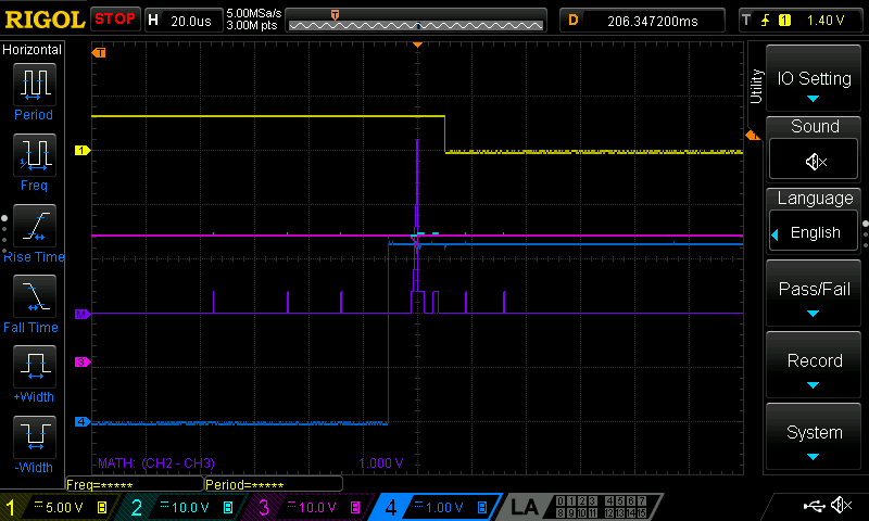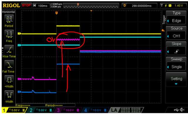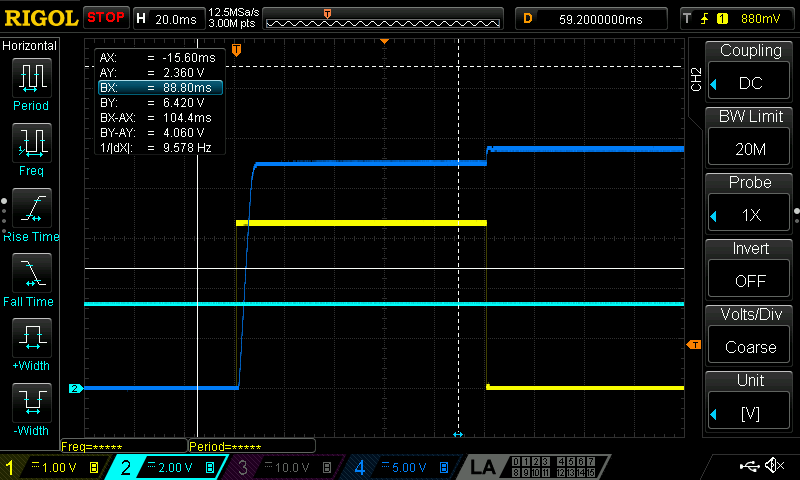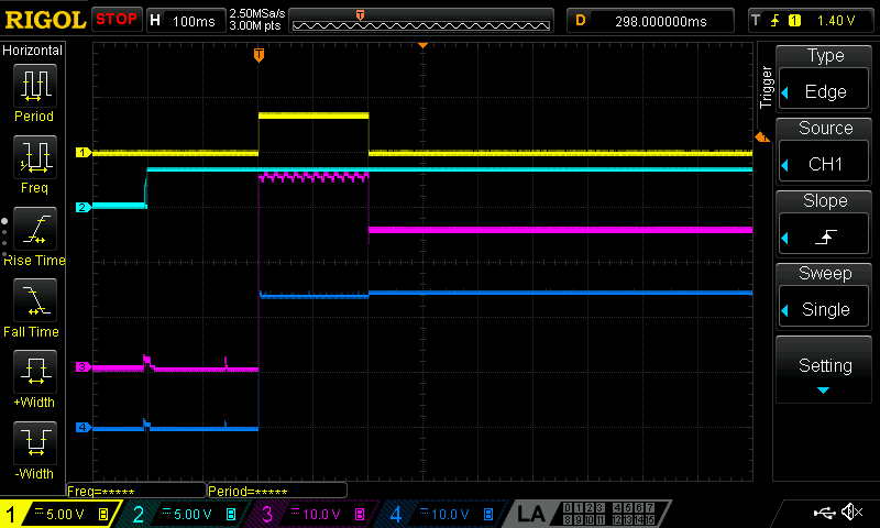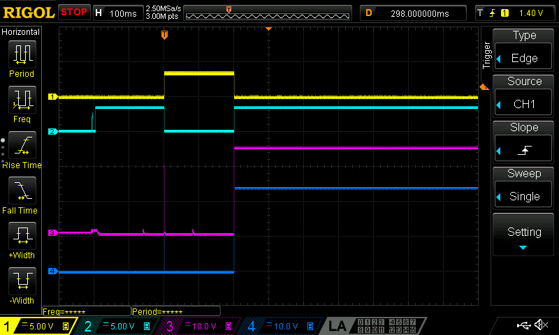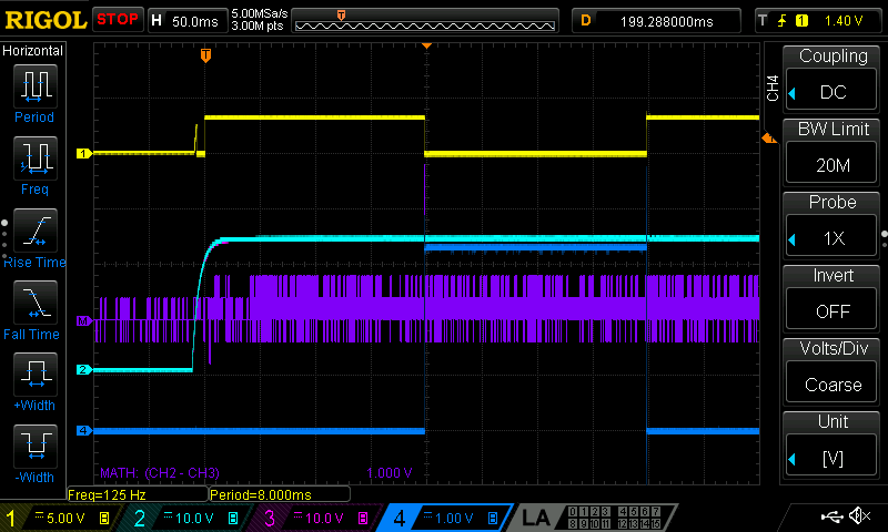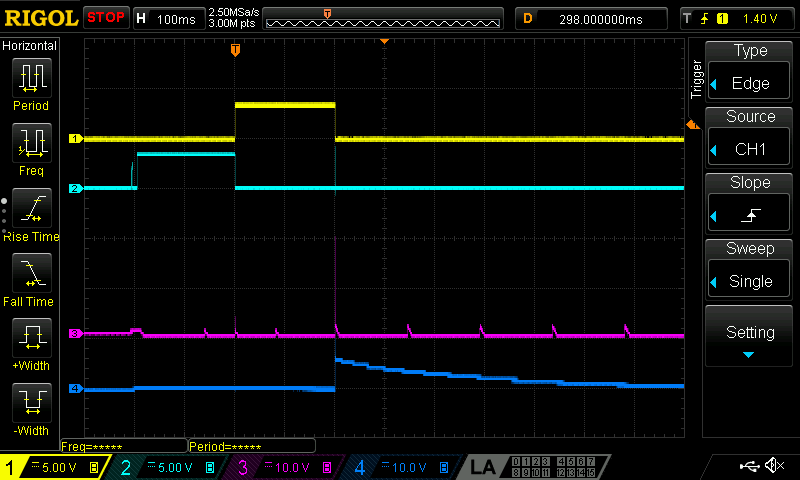 No load starting works fine. This same sequence of INP_G high for 200ms then INP high is repeated for the scope captures below.