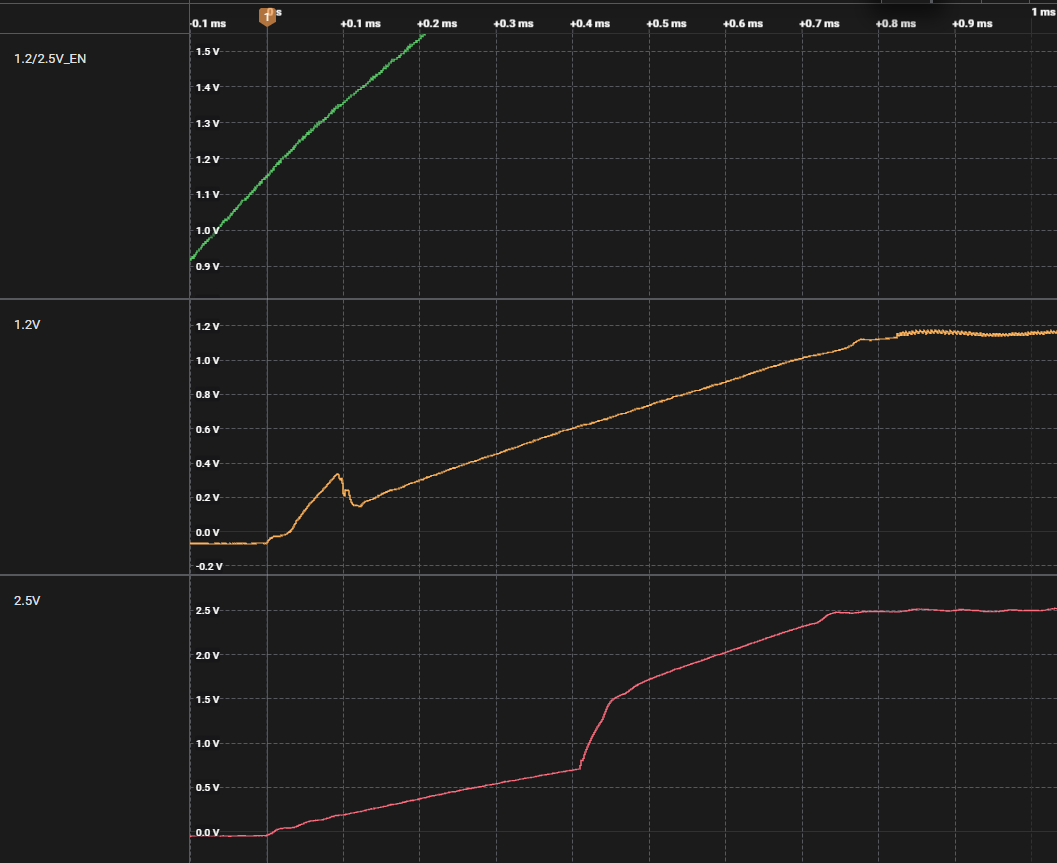 I am using all 3 converters on this part. While DCDC1 and DCDC3 turn on once their respective EN pins reach ~1.15V, the DCDC2 output turns on when its EN pin is at ~700mV. I realize that technically this might be considered an indeterminate state it's between the V_IH(min) =1.3V and the V_IL(max) = 0.4V, but this is repeatable across multiple boards pretty reliably. Why is the EN voltage threshold different on DCDC2 than on DCDC1/3?