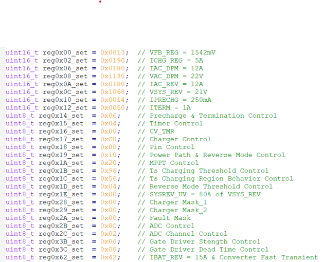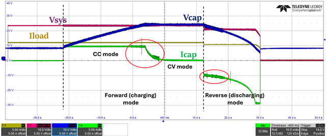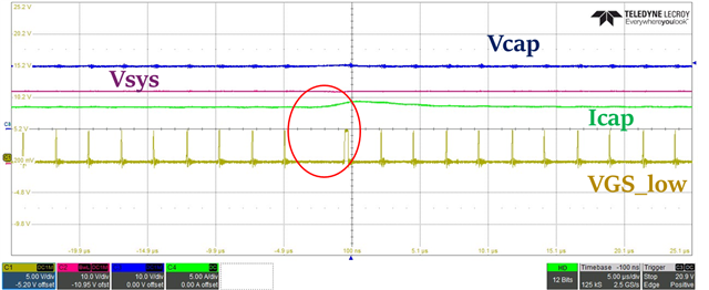 We designed a PCB using the BQ25750 charger IC (based on the BQ25750EVM) to charge a supercapacitor stack. The input voltage and the target stack voltage are both 24V. The register parameters are shown below. The circuit does the intended functionality and works in both forward and reverse modes. However, we are witnessing some ripple in the charging current (red circle region) when the capacitor voltage is close to its target value. A close look at the gate signals of one of the low side switches shows missing gate signals in the noise region. we were able to reduce this noise by setting the lowest deadtime option (45ns), but the noise is not gone completely. We also tried changing the switching frequency but it didn't help. The supercapacitor stack is connected to our boards with 8" twisted pair. Any suggestions as to why those gate pulses are missing and how could we remove the noise completely? Thanks.