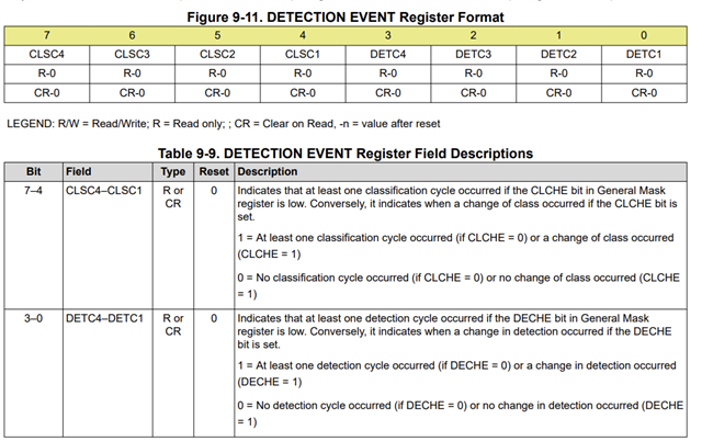 I want to verify whether or not this is an expected behavior when I configure the TPS23881 as an auto-class 4-pair port, and connected to a 2-pair PD (Type 2). I see the PD load powered up successfully but I continue to see the the Detection Event Register (0x05h CoR) indicating a detection cycle occurred when I poll status on the I2C bus. Is this due to the fact that the other pair is left unconnected?