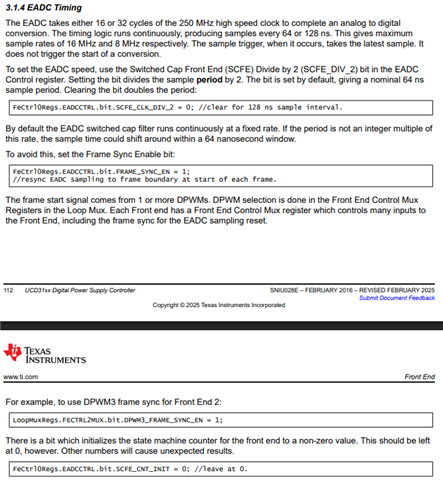 I am working on implementing peak current control with the UCD3138. My control approach requires very fast sampling and update during the on-time. Specifically: