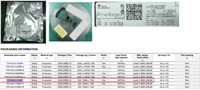 Part number TPS7A8101DRBT was labeled and packed as MSL2, but the datasheet specifies MSL1.