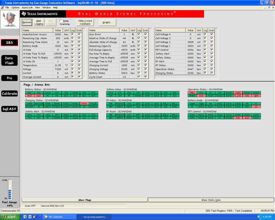 VOK set condition is that last OCV reading is qualified for Qmax update. All of the following needs to be satisfied for VOK to be set: 1) dV/dt<4uV/sec 2) voltage outside of disqualification window 3) temperature below 40C and above 10C VOK set (if all above conditions for last OCV reading are satisfied) when: - discharge starts - charge starts - IT enable command is sent. Note that VOK is NOT set at OCV measurement itself, because OCV measurements will continue until discharge or charge will start. VOK clears when: - Qmax update took place - timer for CC-offset error accumulation has reached estimated 1% error of presently passed charge. Offset error accumulation assumes 10uV offset, so with 10mOh sense resistor it assumes estimated 1mA error current. - on Full Reset (because OCV measurement after reset is considered not accurate enough).