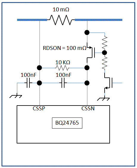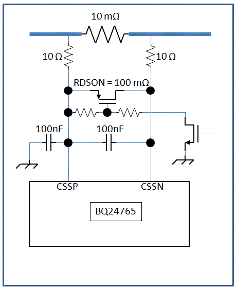 - The second schematic uses two 10ohm resistors before CSSP & CSSN inputs. The PMOS then shorts both inputs when it is ON, and as RDSON=100mohm is little compared to 10ohm, the differential voltage is almost 0mV at the inputs, allowing the charge of the battery. When the MOS is OFF, CCSN & CCSP are no longer shunted, allowing the input current limitation to occur.