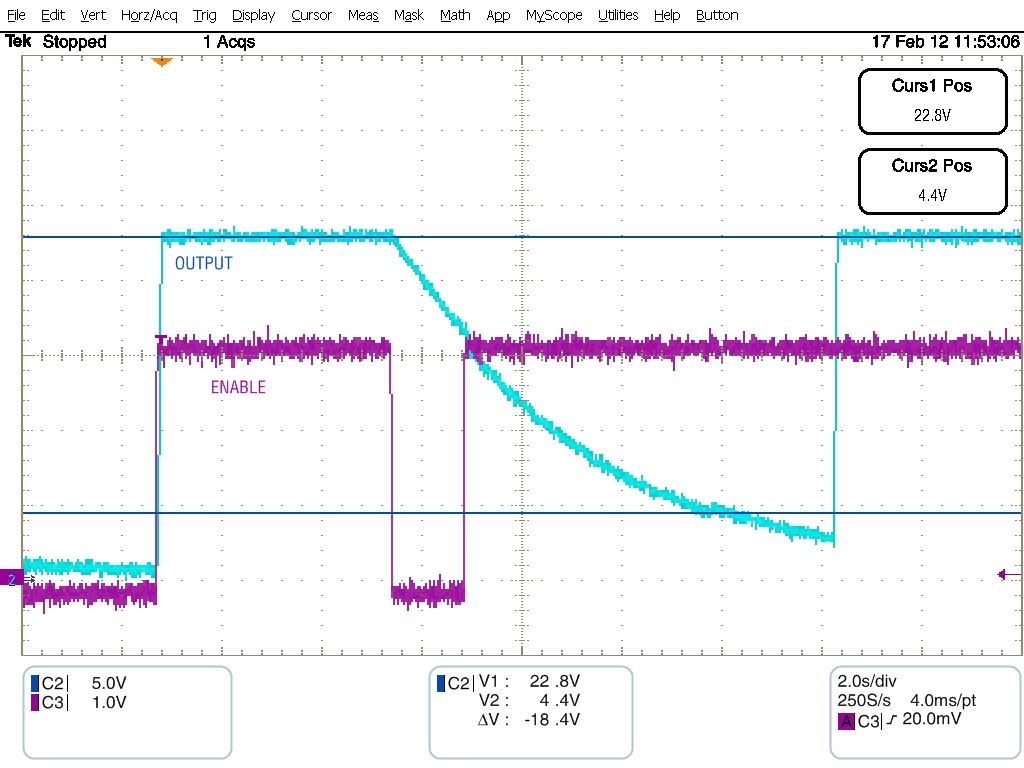 My customer is reporting that the EN pin of the TPS40170 does not support pre-bias under certain conditions. If the enable is toggled on and off as shown below the output is discharages to 4.3V before returning to a programmed output voltage of 23V. We've verified the behavior with and with a SCP resistor on the lower gate. They have a 100nF SS capacitor. UVLO and Boot Capacitors voltages have been verified to be > 0.9V and 4.4V respectively.