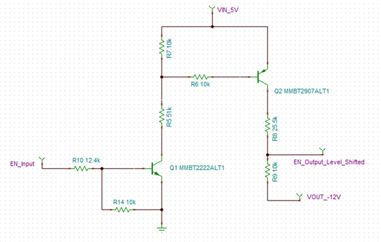 Resistor R6 limits the current into Q2, and resistors R5 and R7 create a voltage divider to turn on Q2 when the EN_Input is high enough. Resistors R10 and R14 create another voltage divider to guarantee that Q1 turns on when the EN_Input reaches above the desired voltage. You can define R10 and R14 by using the equation 1.55*(R14/(R14+R10)) = 0.6V where 0.6V is the saturation voltage of the transistor I used.