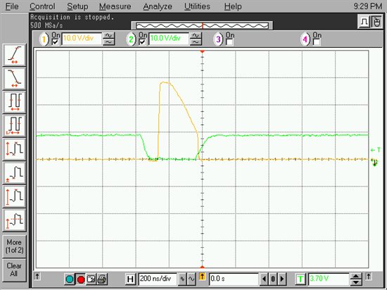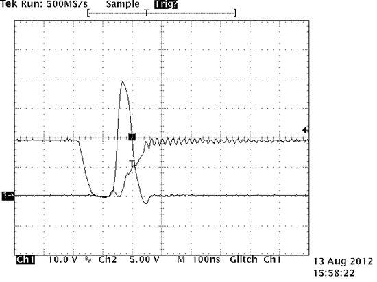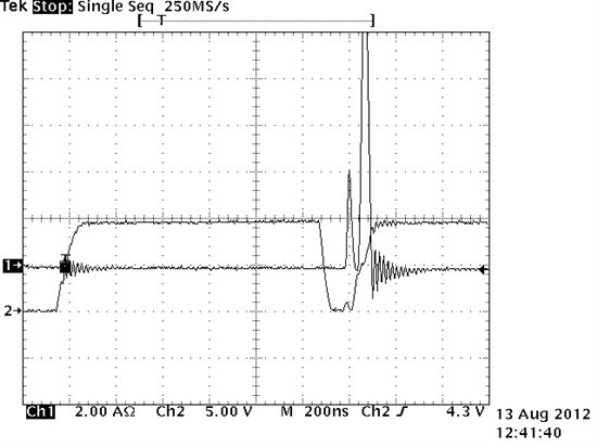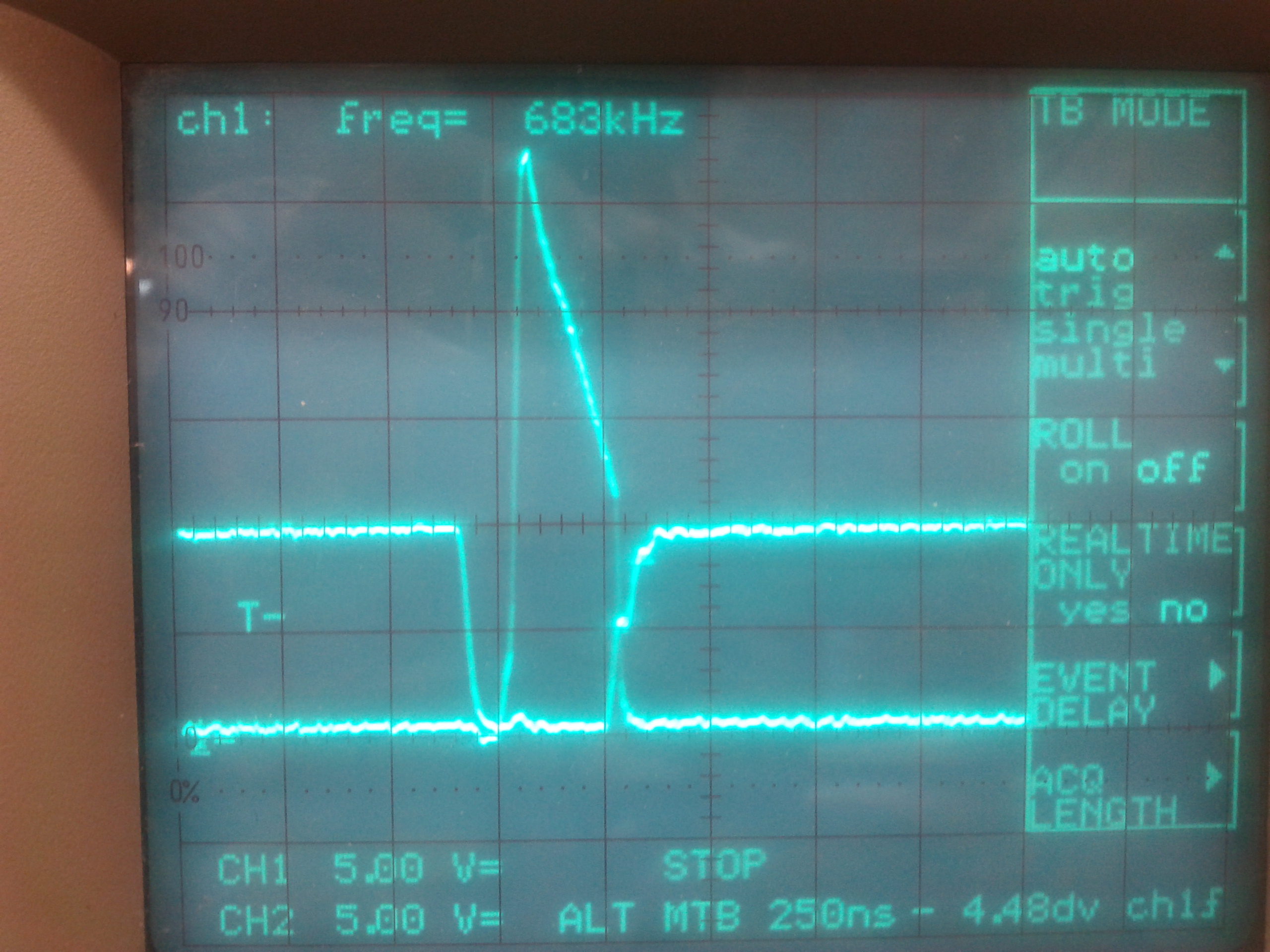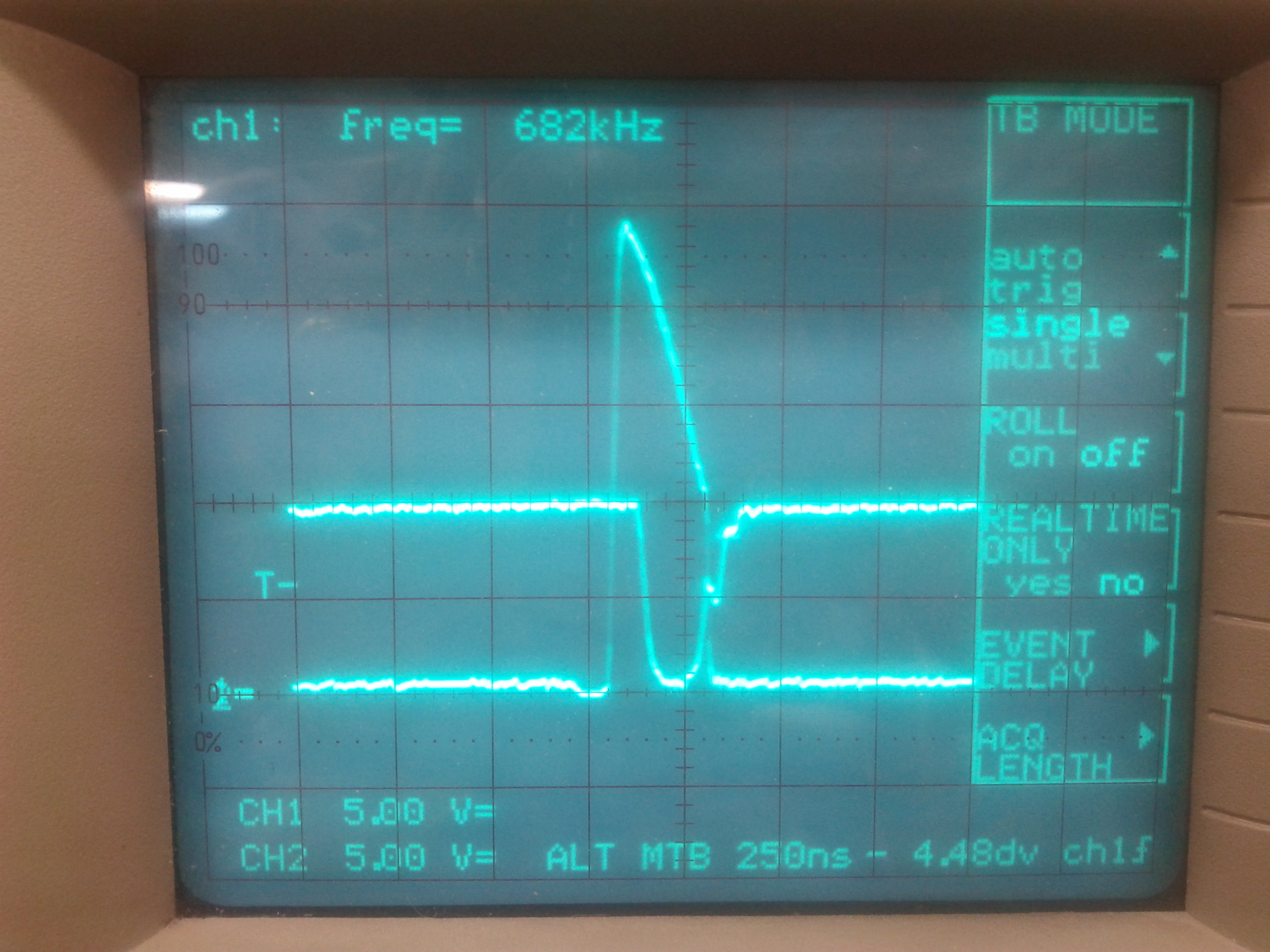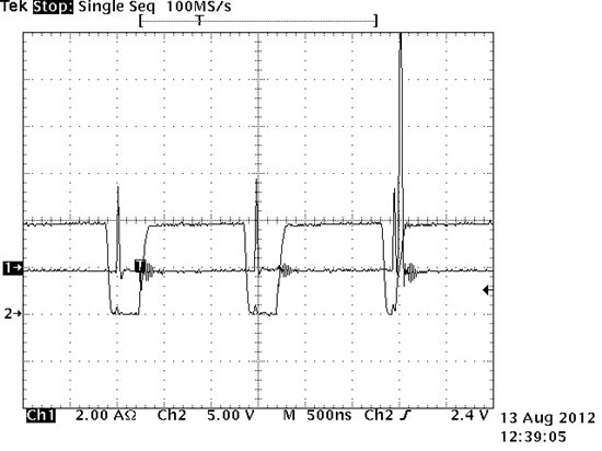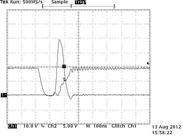 Most of the time, the waveform looks like the second waveform, but occasionally the shoot through is observed as seen in firstwaveform. Although the circuit seem to work without too much heat dissipation in the current revision of boards, changing the Mosfets (to one with lesser gate charge Qgs ) makes the problem worse.