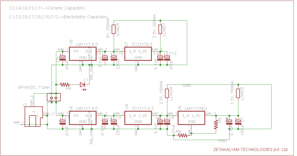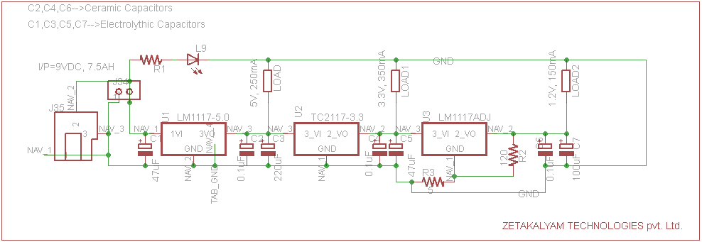 We are using 1.2V,3.3V and 5V and the load consumes 750mA current with the input DC at 7.5V,7AH battery / 9v, 1A from adapter. We are using LM1117(800mA) regulators for this.But we have a problem in this design.We are facing a overload problem and also the regulators gets more heat.So please give me the suggestions to solve this problem .I have attached our power supply schematic diagram (two files,we are tried both the types).