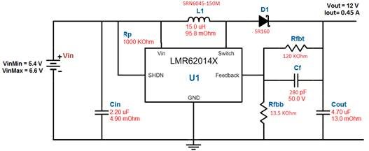 I am using a LMR62014 IC for step up from 5.5VDC input to 12VDC output with an output current of 450mA.