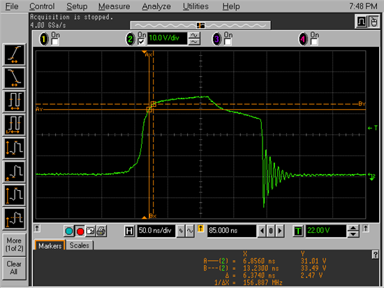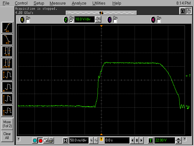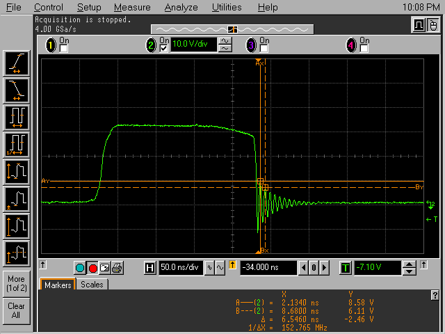 As you can see, the rising edge is pretty good with no ringing, but the falling edge (HS-FET turning off) shows considerable ringing. This seems a bit odd, but this is the case. I believe that what is happening is that the noise from the ringing is causing the controller to sense an OCP or SCP fault and then turning off the supply. It continues to 'hiccup' until the input voltage is high enough, at which point the rail comes up as shown above.