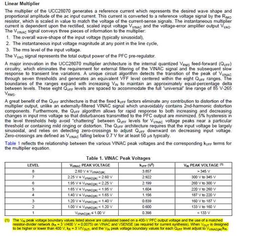 1. I am pleased with the UCC28070 in our application. Our load is a big pulse discharge that effectively causes the boost current to hit the PKLMT for a couple cycles. Works great. The question I have is the value of Vinac relative to output voltage. Note 1 from sheet 28 of the 28070 spec is highlighted below and I am a bit uncertain of its meaning. I would like any opinions on the exact meaning of note 1 and what the Vinac value should be as output voltage changes from 400 - 800. The power system is controlled by an Altera FPGA and I have lots of resources for control functions, realtime math, ROM table values or whatever.