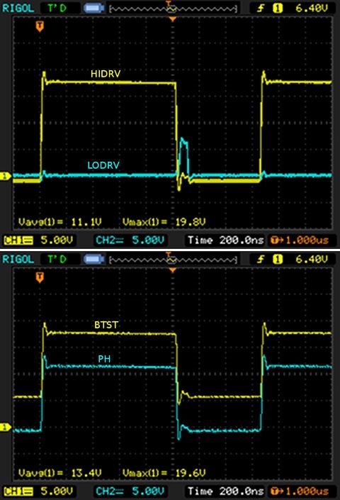 I captured the following waveforms: HIDRV, LODRV, BTST, and PH (see images below). HIDRV seems reasonable to me, but I expect LODRV to drive when HIDRV is off, but it's only on for the first portion of its window. When I try this same test using the bq24610EVM board LODRV is driving when HIDRV is off and I get the correct charge current.