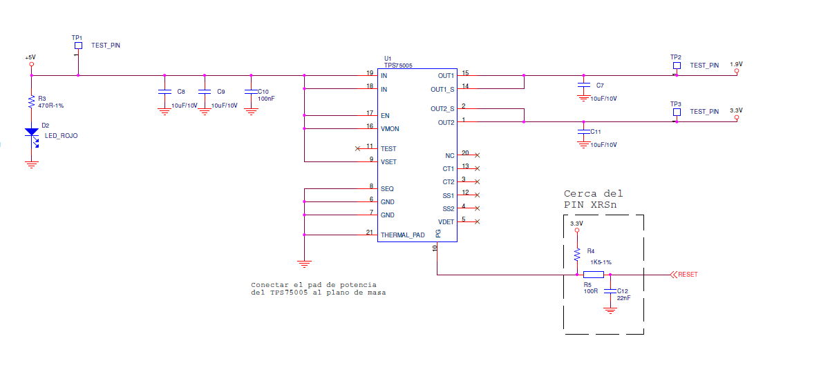 We have around 84uF connected at VOUT2 (distributed in all the PCB), so we know that TPS75005 could be current protected due to this big capacitance, but we think that if this was the case, VOUT2 should return to LDO2 Ramp state, not remaining at some fixed voltage.