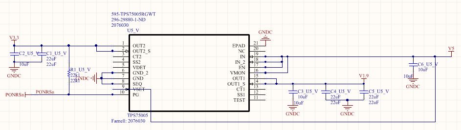 I'm using a TPS75005 (integrated MCU power solution) with a Delfino F28335. I'm using with SEQ=L, VSET=H (1.9V) and i'm not using the third voltage monitor, so EN=VMON=VIN.