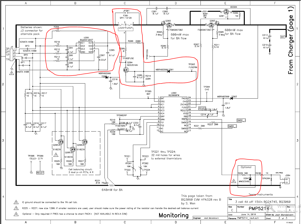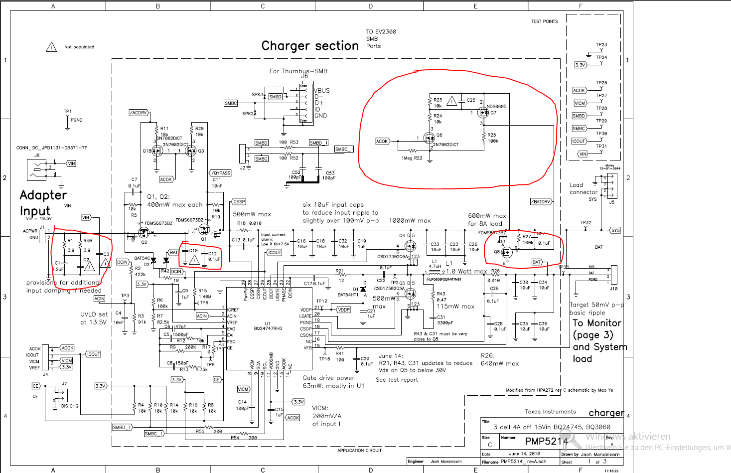My Charger IC is the BQ 24745 with the same components as in the reference design (just left out the red marked I think that are features and not needed). As Balancer IC I use BQ 3060 with the same components as in the reference design but with out the optional things like FUSE (in my schematic this pin is on ground), second safety IC BQ29412 and PRES (it's on ground).