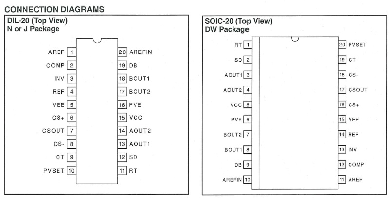 In the UC3638 datasheet, the pin function description looks not consistent for SOIC-20 DW package and DIL-20 package. It looks like SOIC-20 DW package pin descriptions are not correct. Anybody can double check and confirm?