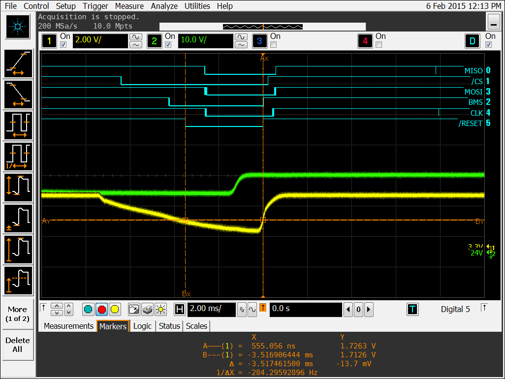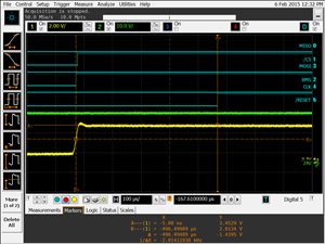 Scope plot shows the reset was released after 500 us. On a slower power rise, the CPU is corrupted when the reset releases before voltage is stable.