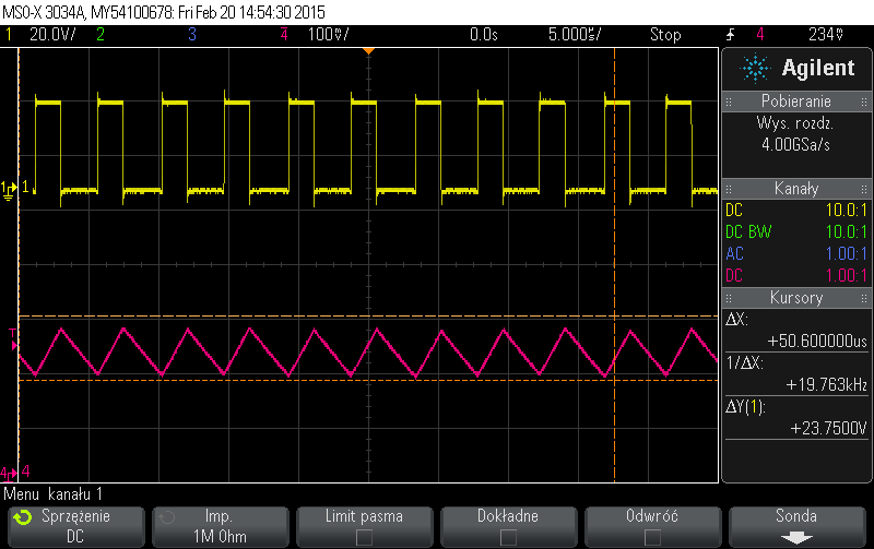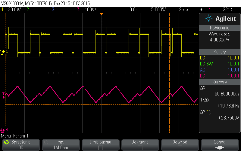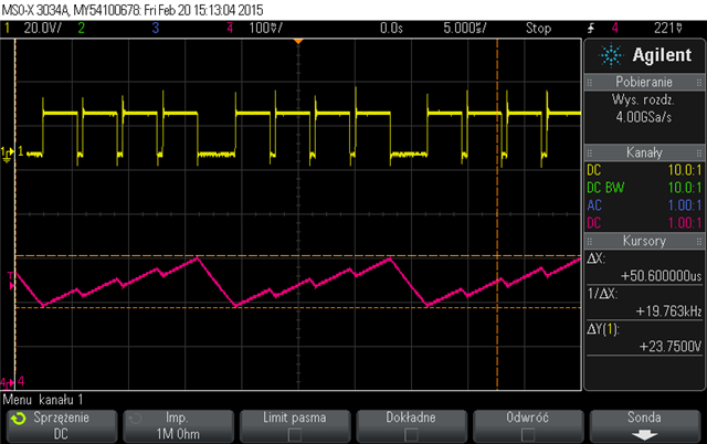 For the voltage mode (when the output voltage is constant = 15V) there is no problem. When the output current increases the output voltage of the converter goes down, and for the Vin = 32V, and Vout ~12V the working freq is stable and the waveforms of the SW voltage (yellow) and inductor current (red) are pictured below: