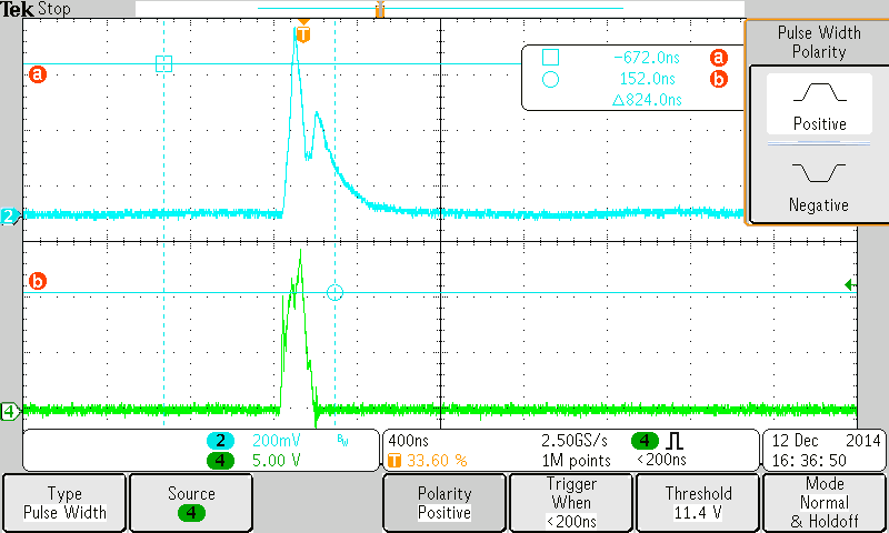 I am working on improving an existing flyback convertor design for EMC and while I was under the hood I noticed a potential issue. In particular, I am noticing the current mode controller PWM IC, UCC28C43, terminate it's ON cycle prematurely under certain load conditions. The output voltages are fine and the product on the whole does not report any glitches or errors from any of the voltage supervisors. I captured the CS (current sense, blue) and the OUT (gate drive, green) at the controller pins on the scope, shown below in fig1. Vcs is not crossing the 1V threshold (thanks to RC filtering), which rules out the current-limiting condition for terminating the ON cycle, so I am trying to grasp the reason why this may be happening. Maybe some of you may have seen such a scenario in your designs. I am attaching a plot of how a good ON cycle should look like in fig 2. The OUT (gate drive) was captured using infinite persistence in fig 3, to show good and bad ON cycles.