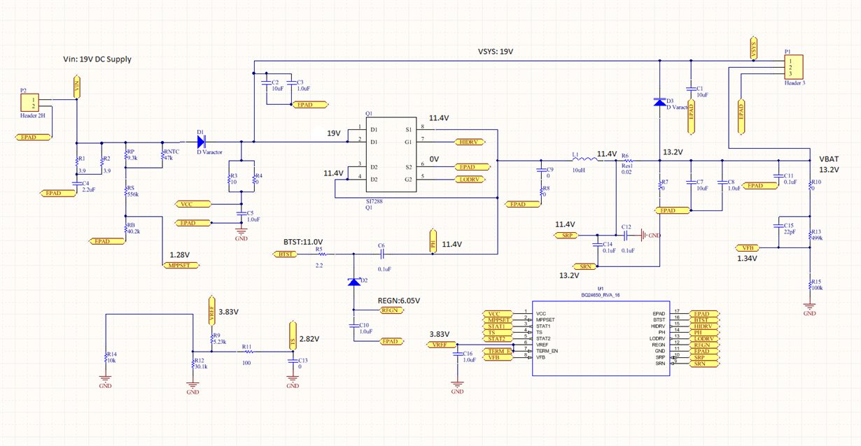 I am using the EVM circuit design with an added NTC thermistor for temp compensation on the solar panel. I am charging an LiFePO 12.8V battery pack with 18Vmppt from the solar panel. The EVM is working correctly, but my design is not charging.