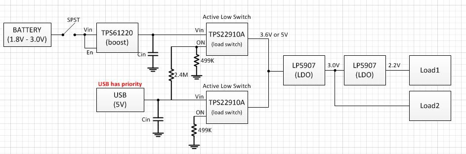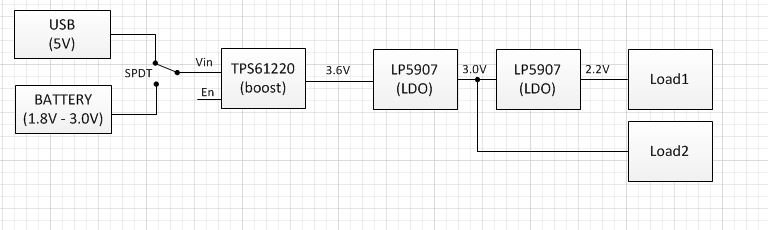 I am creating a design for low power applications. The power supply can be either 2AA batteries (1.8V to 3.0V) or USB power (5V). I need 3.0V and 2.2V to power the devices on my board. The bypass pin will be connected to the MSP430. The current needed at the output of the TPS61291 is no more than 75mA.