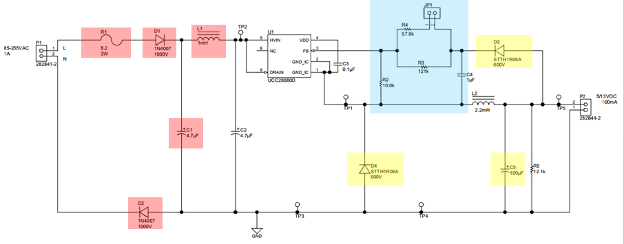 Red region: Because of the input side is a battery of a 100VDC, so we can remove R1, D1, D2 L1 and C1. is it right ?