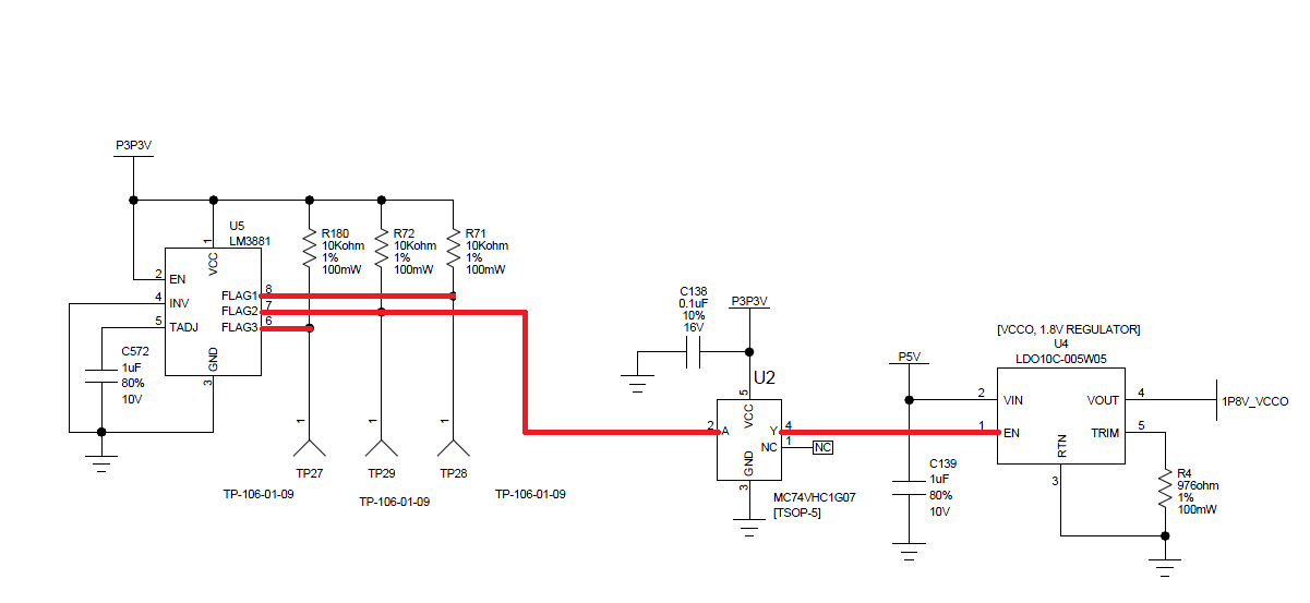 Our current setup can be seen in Figure 2; we followed the Typical Application note but used 10k pullup resistors on Flags 1-3 instead of 100k resistors. Flag 2 is passed through a buffer to enable a 1.8V regulator, where the spike prematurely activates the regulator (See highlighted signal path).